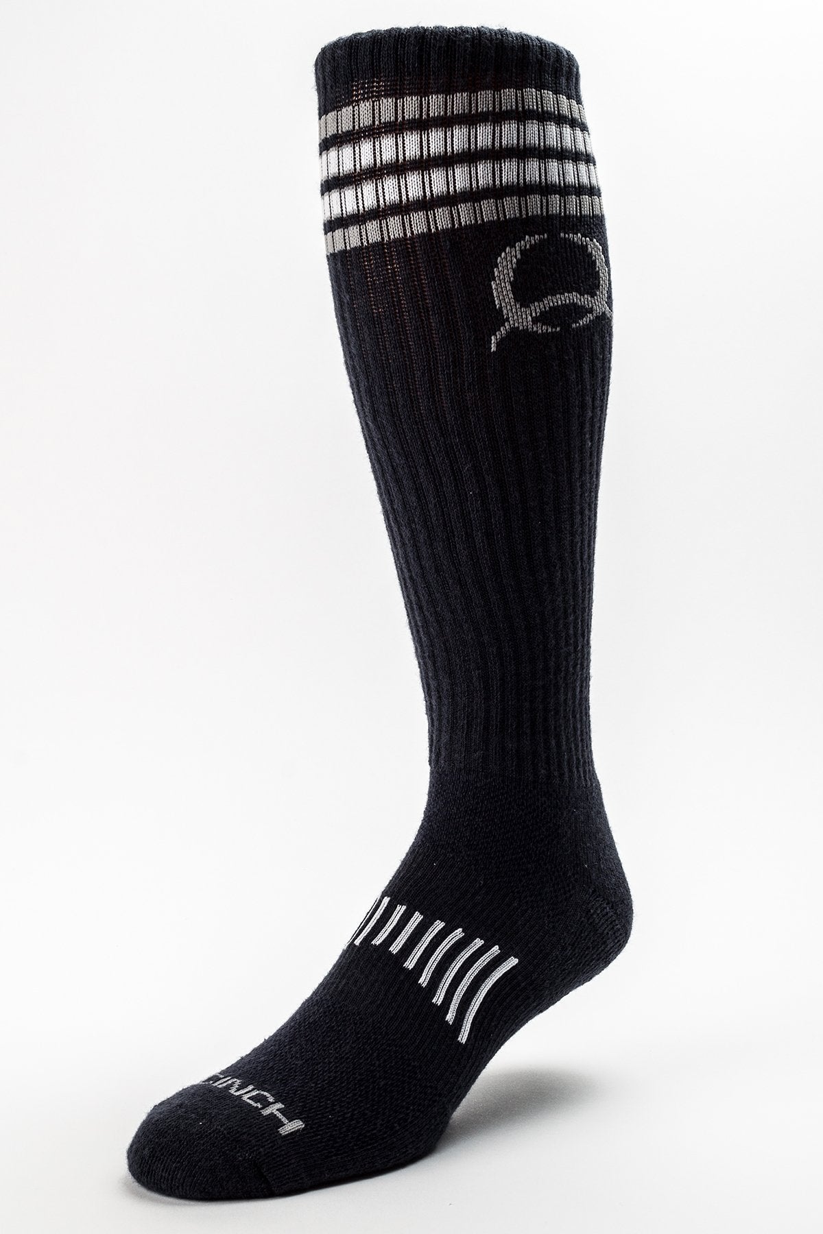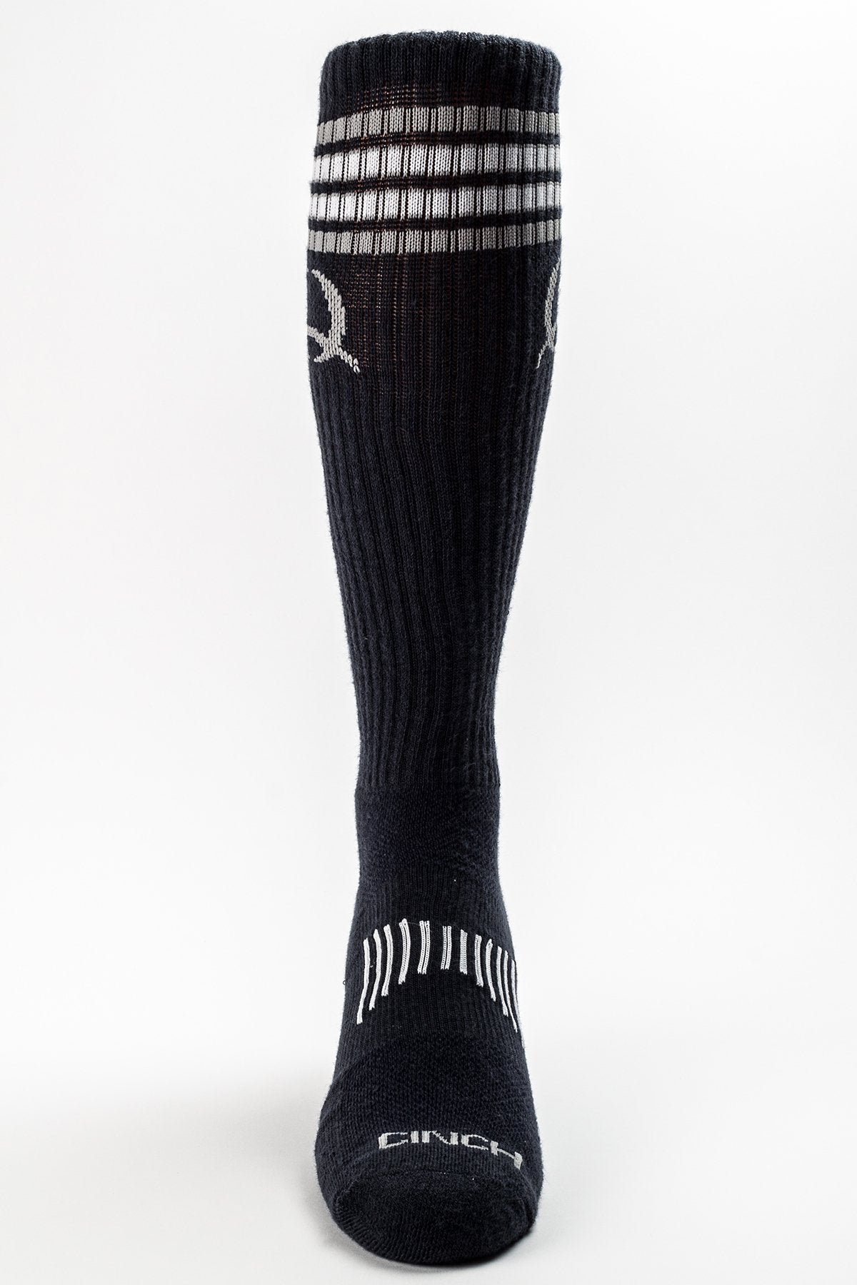Made for the working man. the Cinch Men’s Logo Tall Boot Socks in Navy can handle any job the wearer takes on. Made in the USA. these Cinch socks are equipped with arch support. targeted cushioning for all-day comfort. and cooling mesh panels to wick moisture away. keeping your feet dry and fresh. Finished with the Cinch logo. you can sport your favorite brand at the ranch or around town!