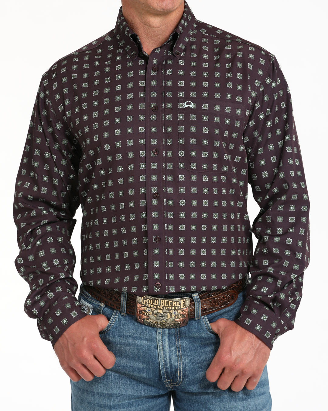 Throw a rope or a bale of hay and look good doing it wearing this handsome purple printed Arenaflex engineered by CINCH. Stretch friendly poly-spandex construction features an open left front pocket. embroidered logo. and purple buttons.