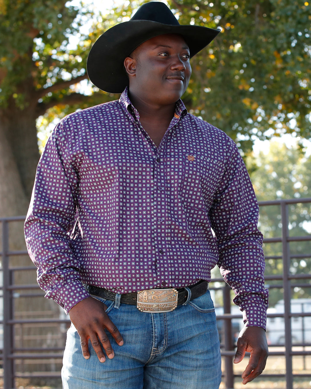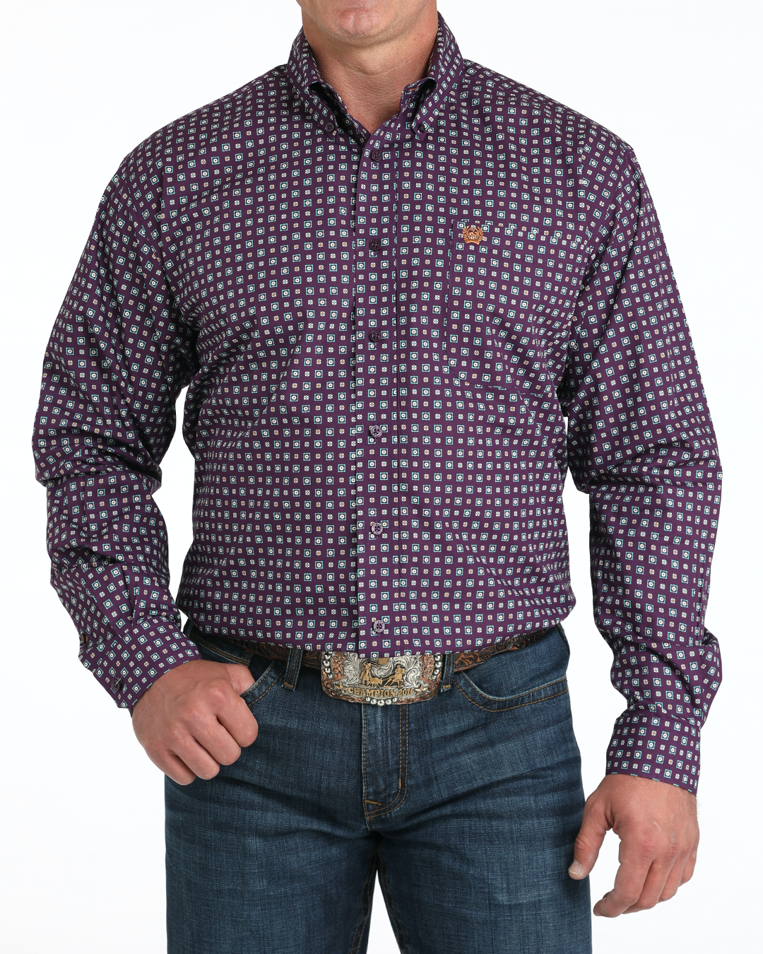 Classic and timeless. this purple medallion printed cotton plain weave by CINCH combines must-have design elements with modern flair. Features include an open left front pocket. embroidered logo. and purple buttons.