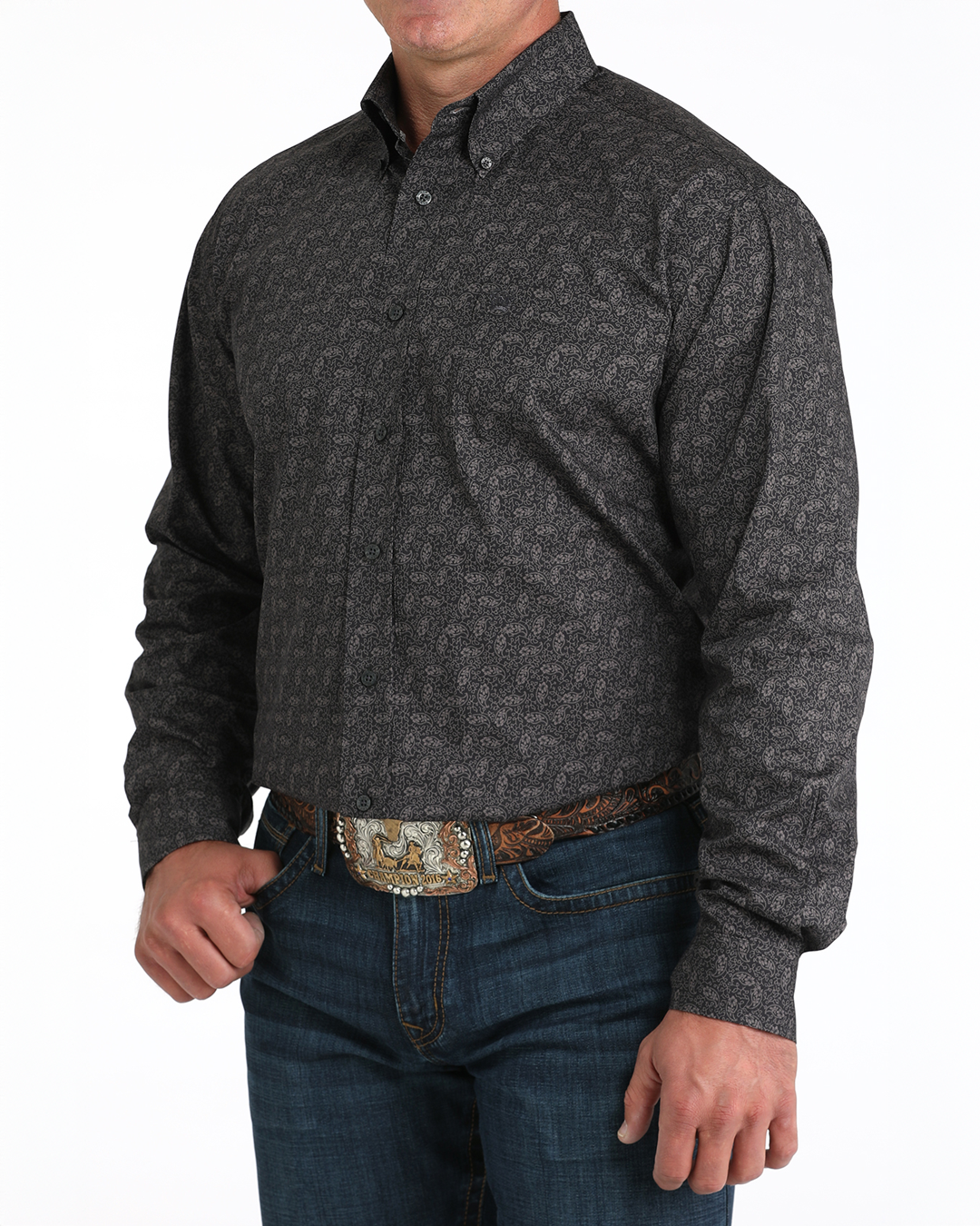 Engineered in a mood-boosting floral print. this charcoal cotton plain weave is a necessity for wearing to the office and after hours. Design features include an open left front pocket. embroidered CINCH logo. and charcoal buttons.