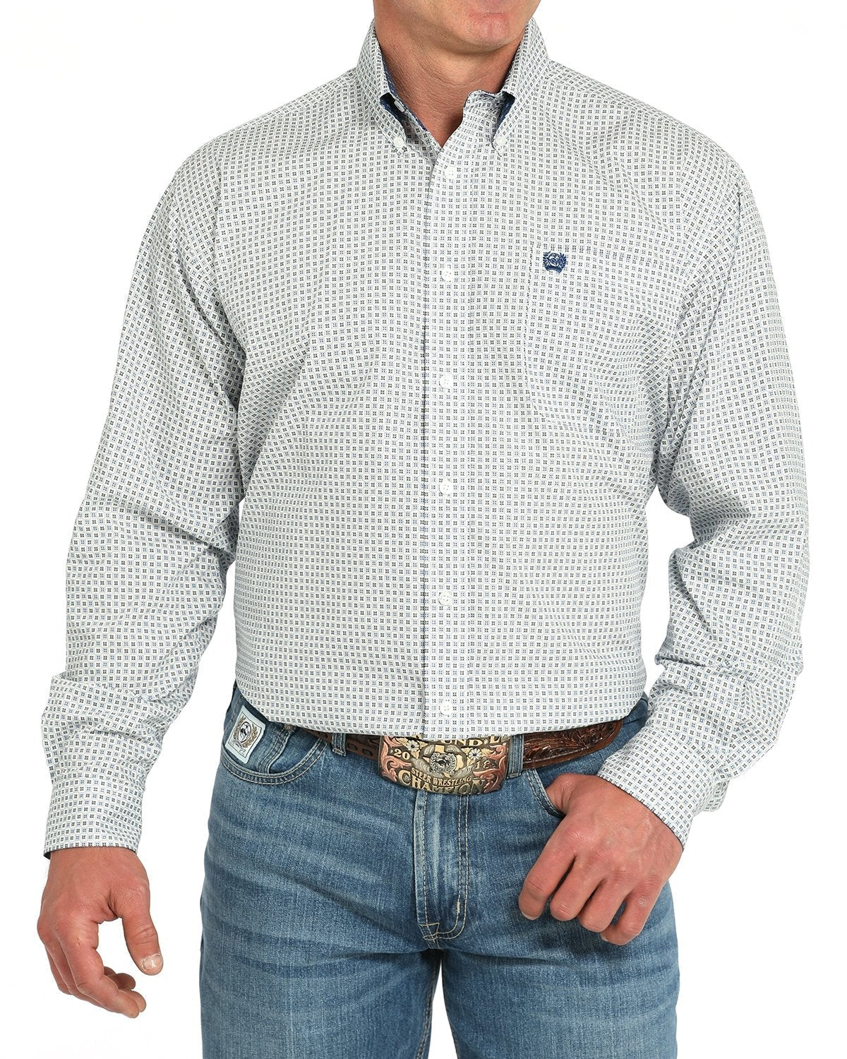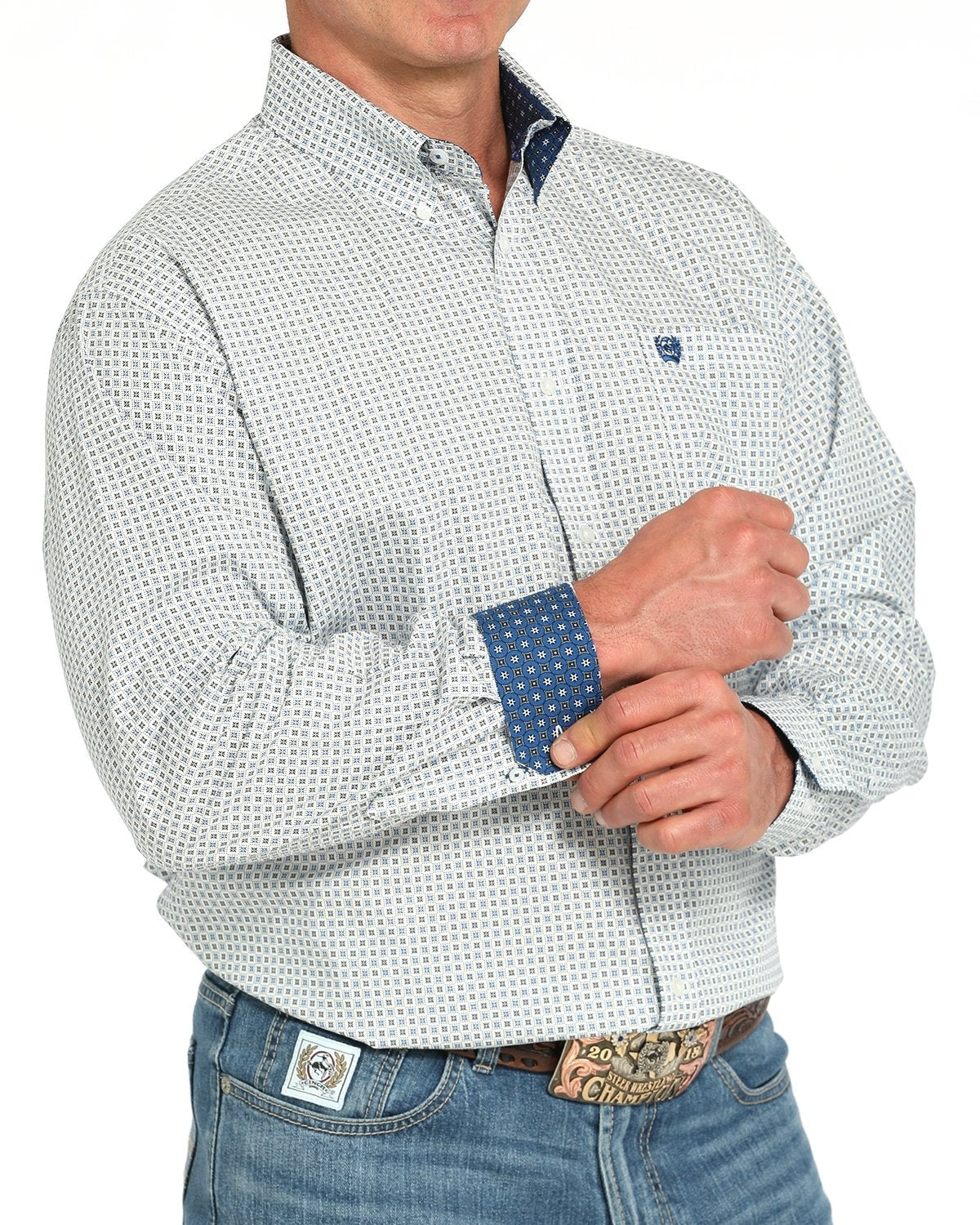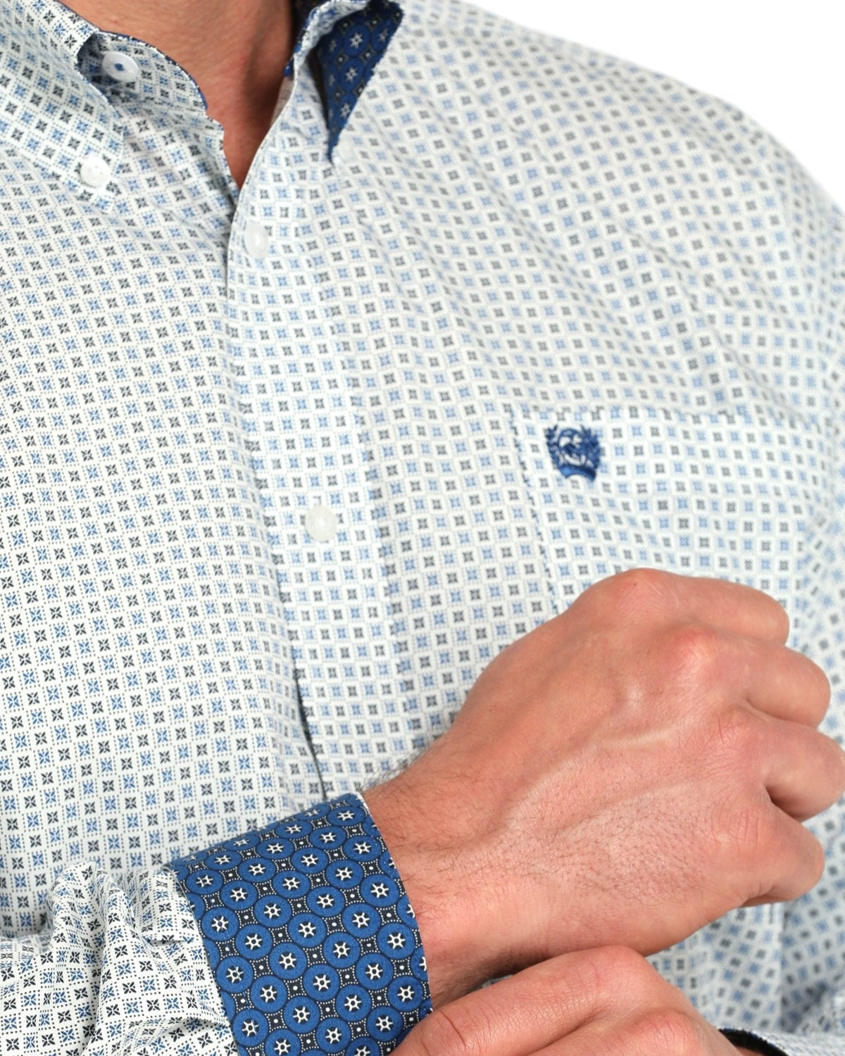 Engineered in white printed cotton plain weave. this classic by CINCH is made for turning heads. Design features include royal blue geometric contrast trim. an open left front pocket. embroidered logo. and white buttons.