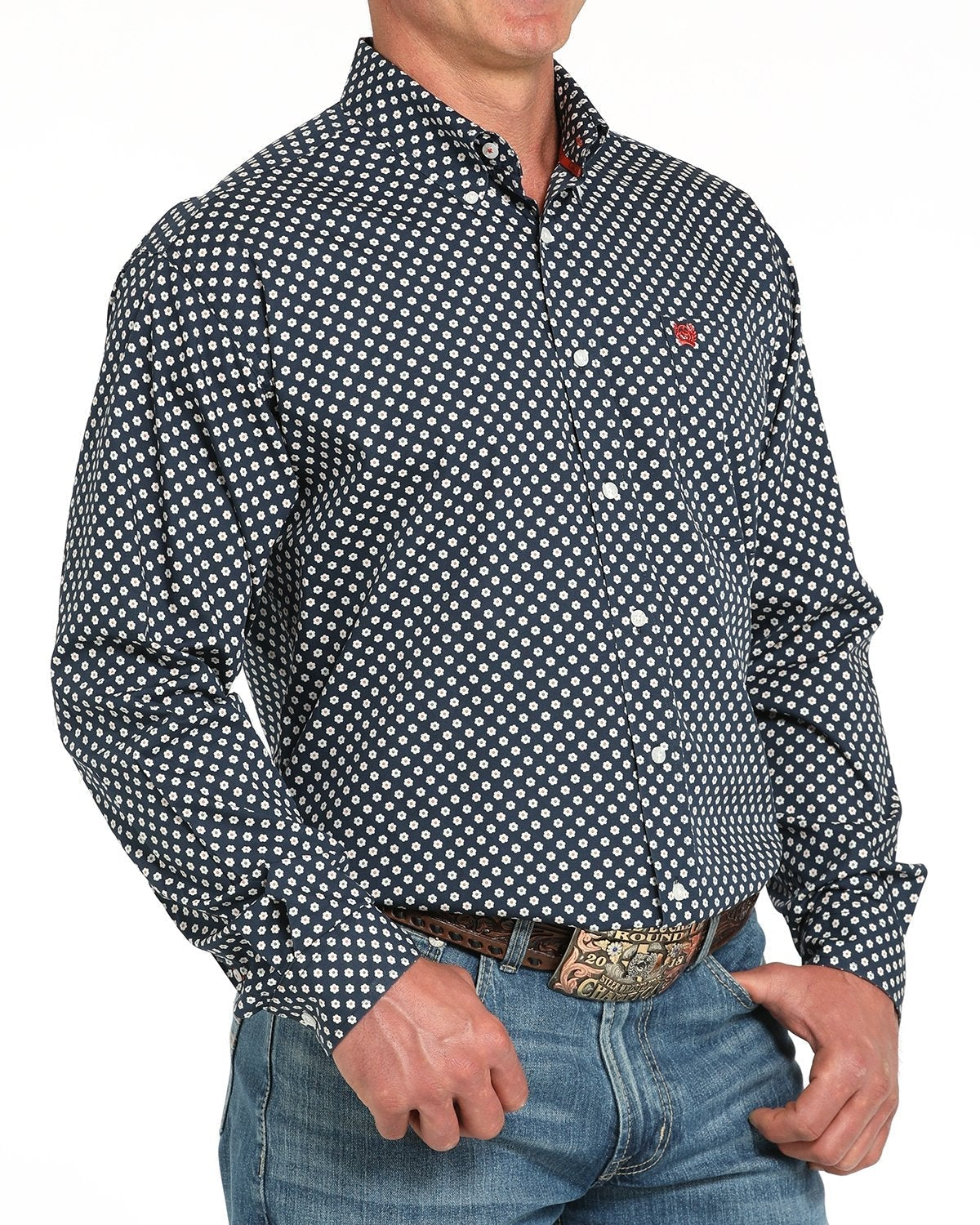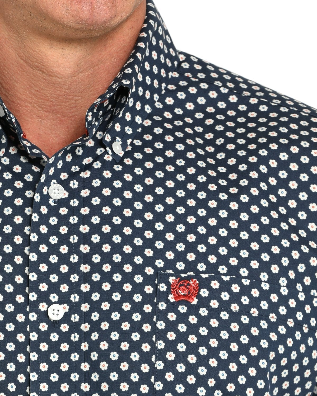 This navy cotton plain weave with an all-over floral-inspired print may be your next go-to favorite. A handsome choice to pair with new CINCH blue jeans. this classic shirt features an open left front pocket. embroidered logo. and white buttons.