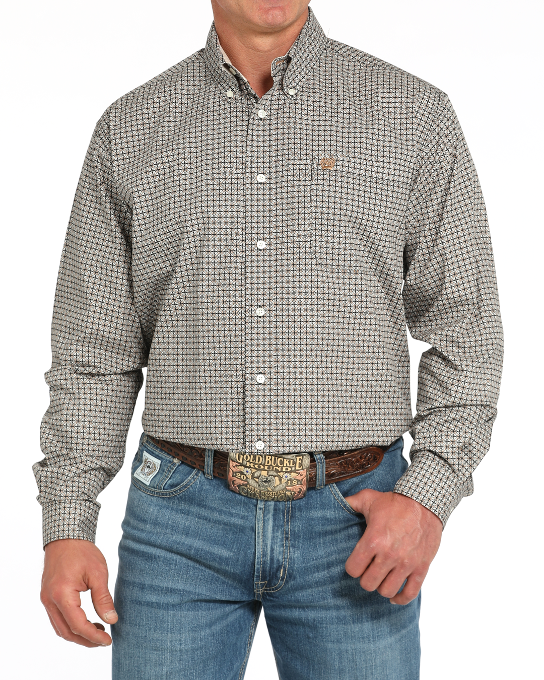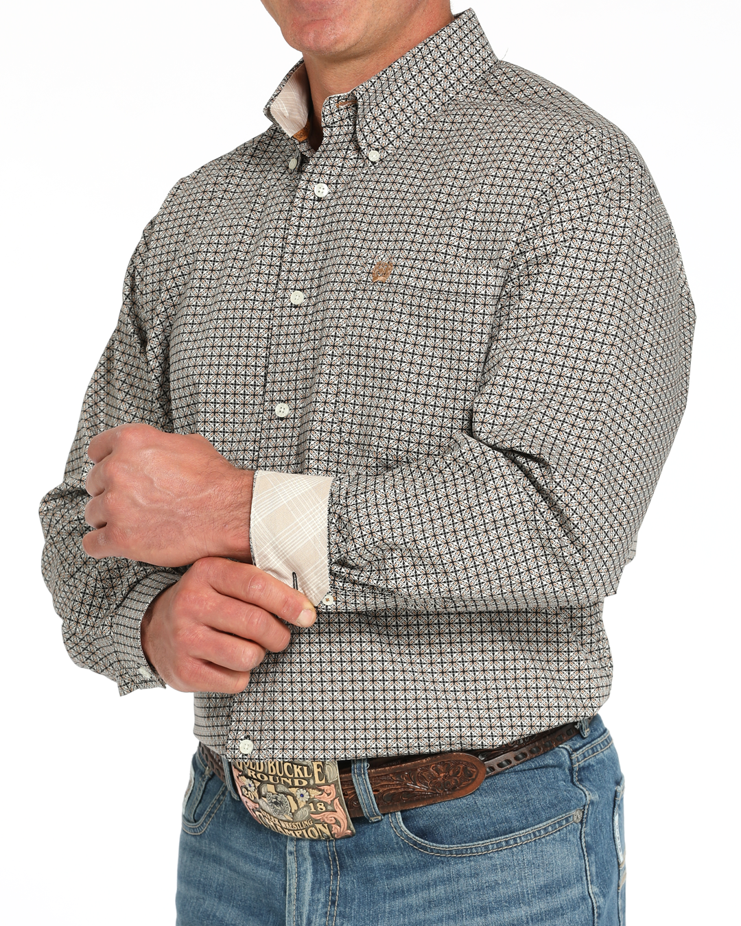 Wow them at the office or in the arena wearing a standout multi-color printed cotton plain weave engineered by CINCH. This handsome shirt features khaki plaid contrast trim. an open left front pocket. embroidered logo. and cream buttons.