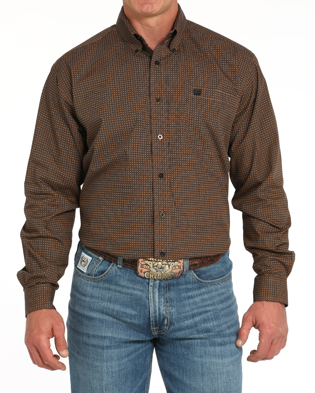 With long lasting comfort and enduring style. this brown geometric printed classic by CINCH is a must. Cotton plain weave construction features an open left front pocket. embroidered logo. and black buttons.