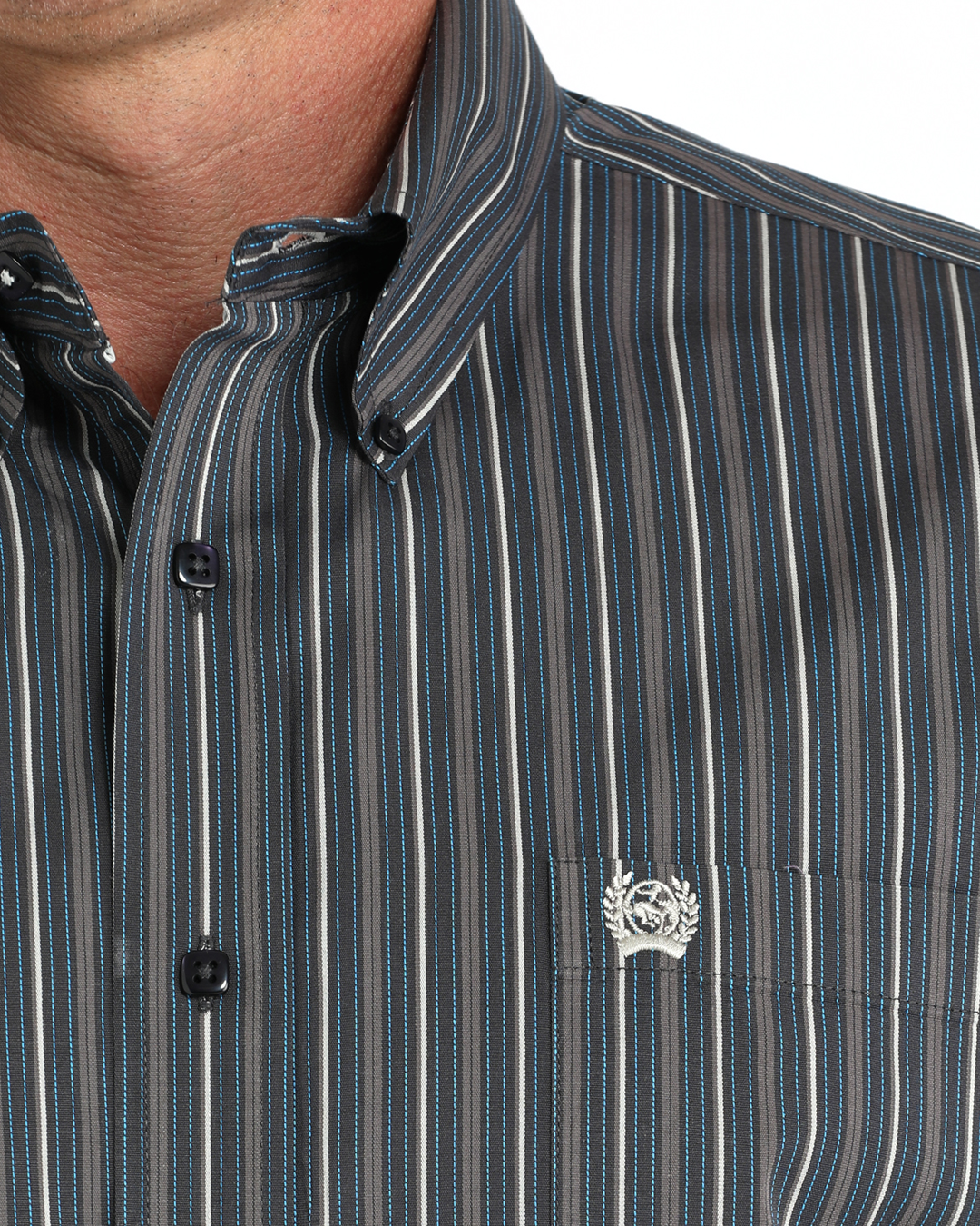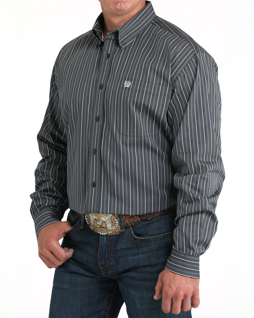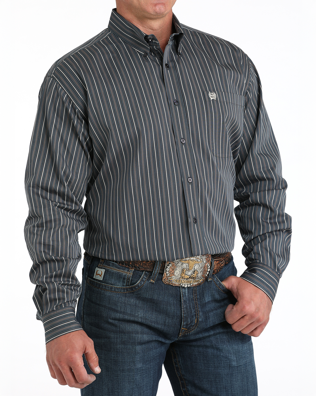 This eye-catching charcoal striped classic is made up in dobby cotton plain weave for a unique. textured look. Featuring charcoal square buttons and an open left front pocket with embroidered CINCH logo. this shirt is sure to elevate your favorite blue jeans.