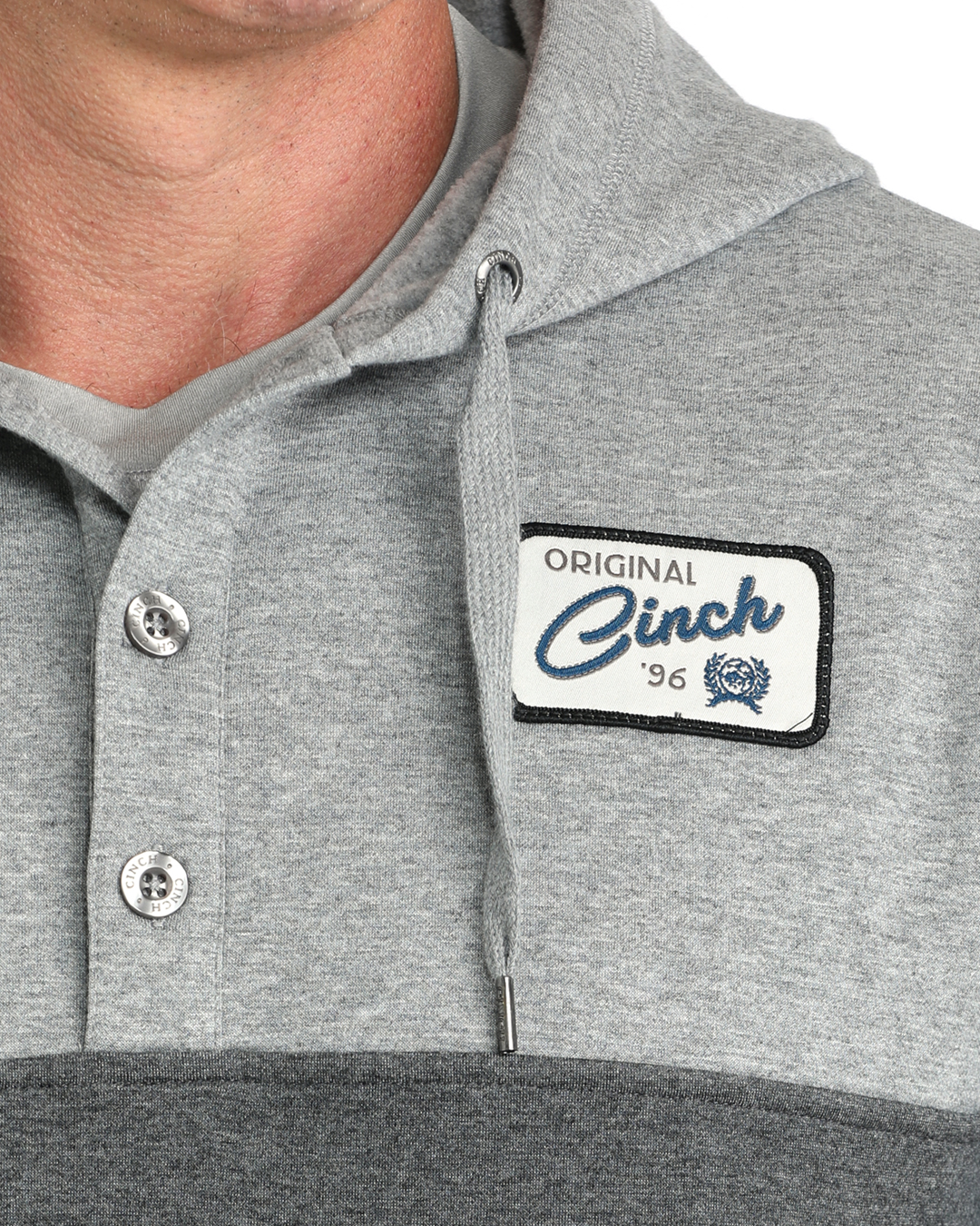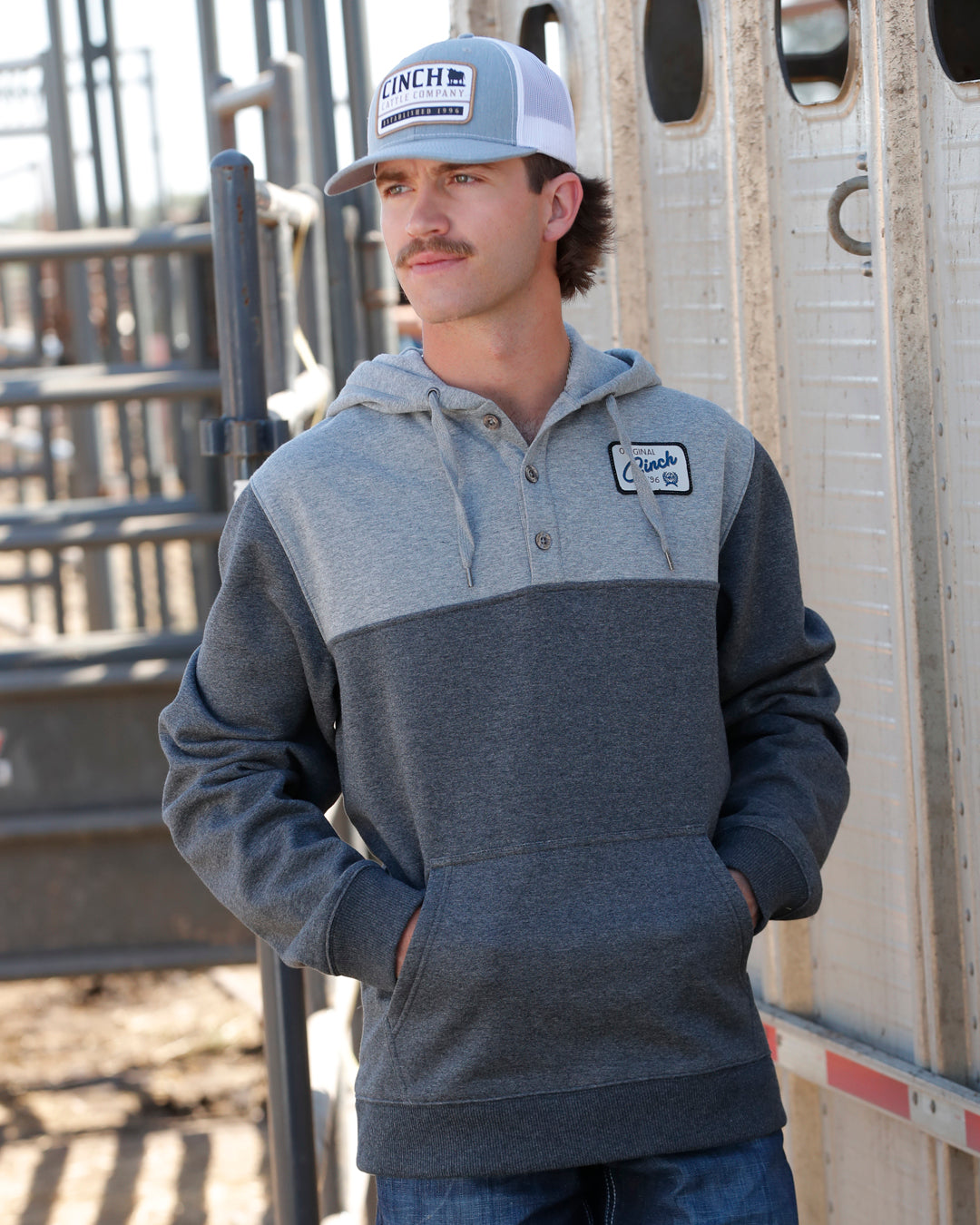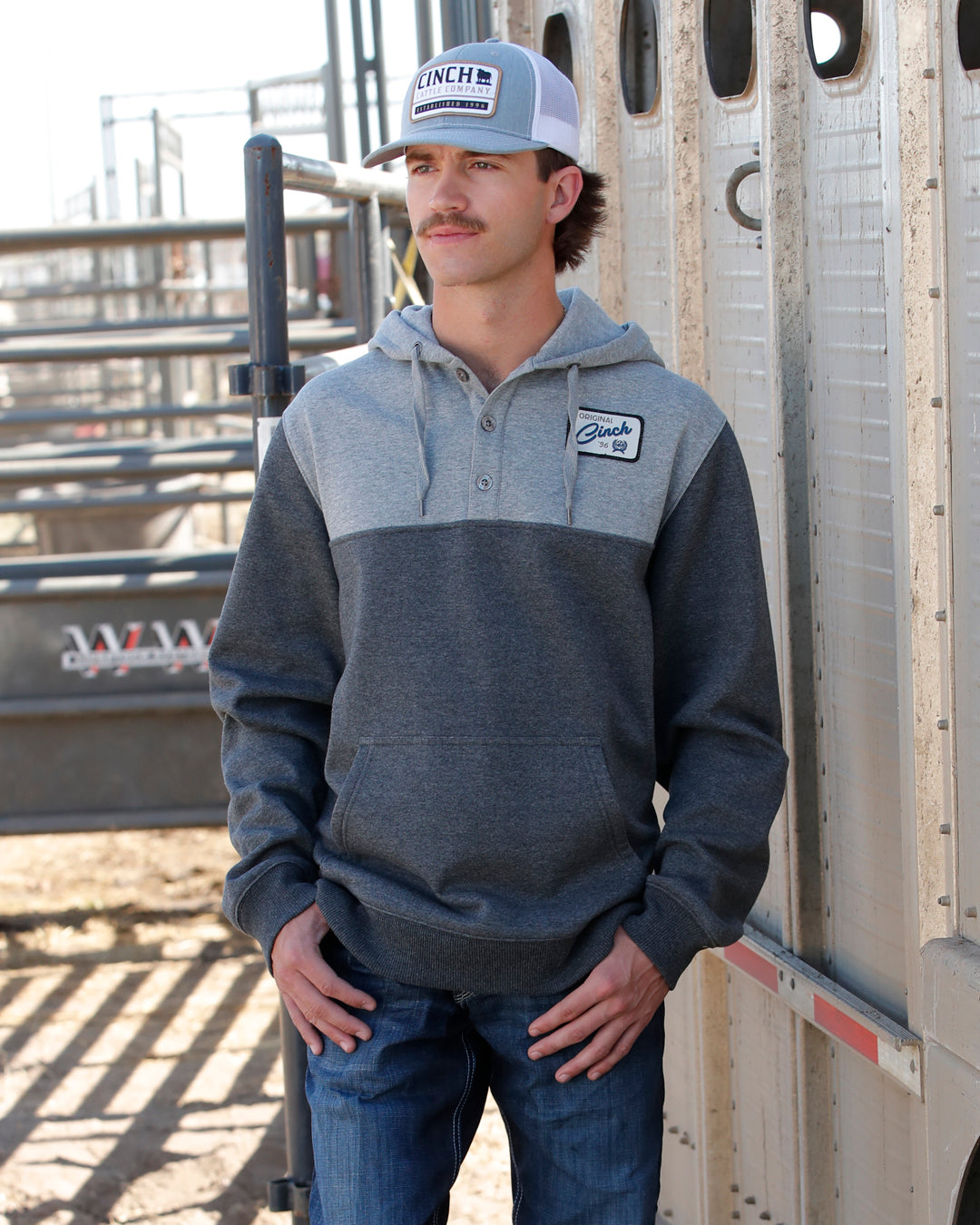 Color blocked and warm enough for any brisk fall morning. this charcoal hoodie by CINCH is cozy comfort at its best. Our must-have layer features a button placket. rib knit trim. and a woven logo patch.