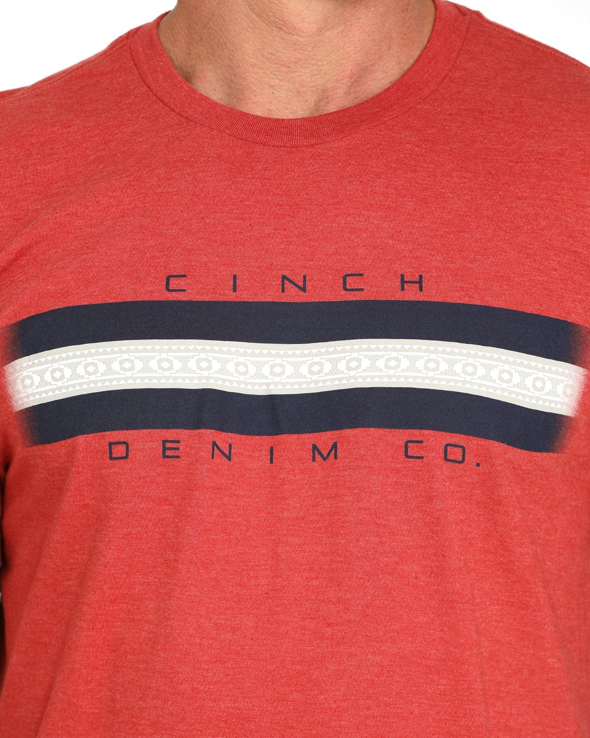 Offering casual comfort wherever the day takes you. our red cotton-poly crew neck tee shirt will never let you down. Designed with a CINCH Denim Co. front screen print. this tee is a dependable classic that pairs with any jeans in the stack.