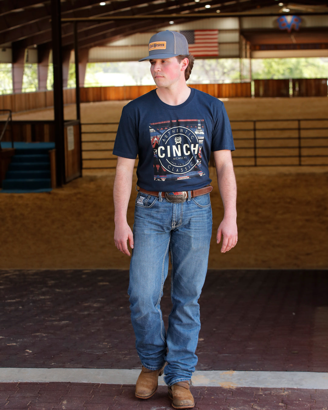 Add simple inspiration to your weekly rotation with a comfortable navy cotton-poly crew neck tee shirt crafted by CINCH. This classic tee features a front screen print and the casual look you’ll want to pair with blue jeans and cowboy boots.