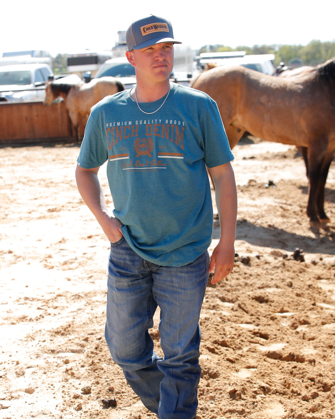 This teal crew-neck tee shirt by CINCH is the perfect tee for a jean-kind of day. It features comfortable cotton-poly construction and a front screen print.