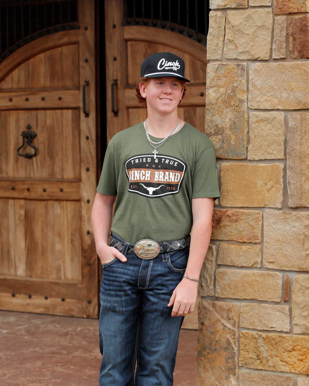 Pay homage to cowboy culture wearing this Tried & True CINCH Brand crew neck tee. Our comfortable olive cotton-poly tee shirt features a front screen print that complements your favorite blue jeans and boots.