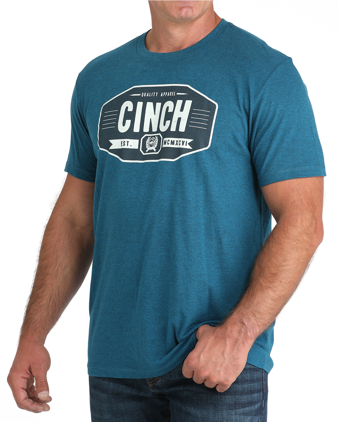 This teal cotton-poly crew neck is the casual. go-to tee you need to pack for every destination. Designed with a CINCH front screen print. our tee makes the perfect match for blue jeans and cowboy boots.