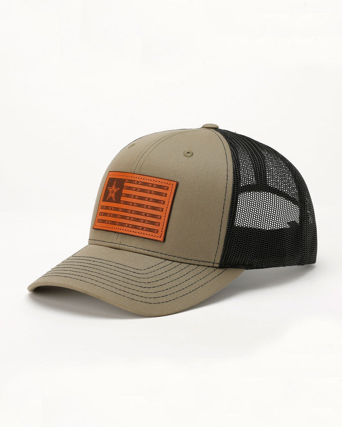 Men’s Old Glory Leather Patch Trucker Cap – Olive and Black