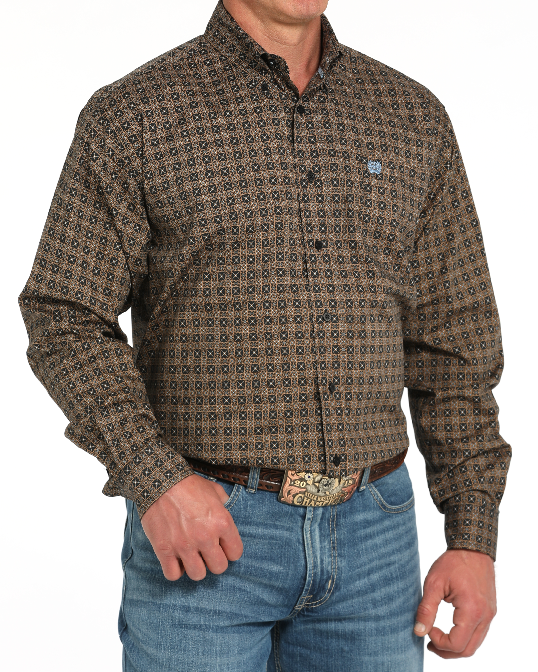 From workdays to special events. this classic black printed button down gets the job done. Design details include stretch friendly cotton-spandex construction. an open left front pocket. embroidered CINCH logo. and black buttons.