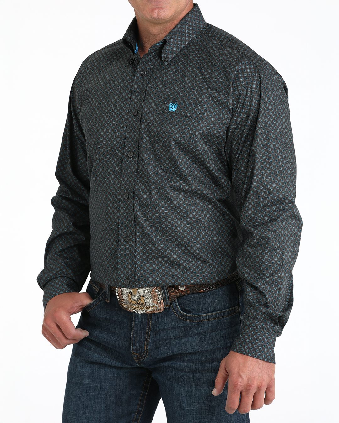 This handsome charcoal geometric printed classic by CINCH is fashion forward and work ready. Stretch friendly cotton-spandex construction features an open left front pocket. embroidered logo. and charcoal buttons.