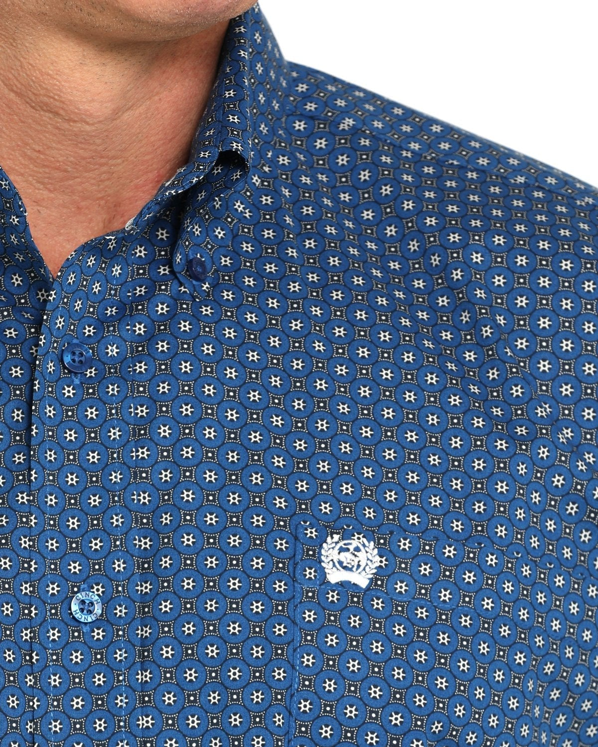 Look sharp and dress for any plans-in-the-making in this handsome royal blue geometric printed classic plain weave crafted by CINCH. This stretch friendly shirt features cotton-spandex construction with an open left front pocket. embroidered logo. and royal blue buttons.