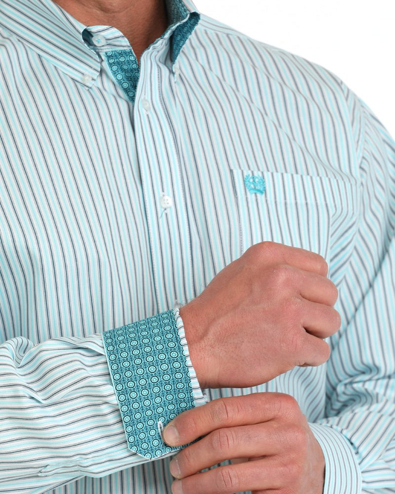 Performance in and out of the arena calls for a stretch friendly cotton-spandex plain weave like this handsome white striped button down by CINCH. Design features include contrast turquoise trim. an open left front pocket. embroidered logo. and white buttons.