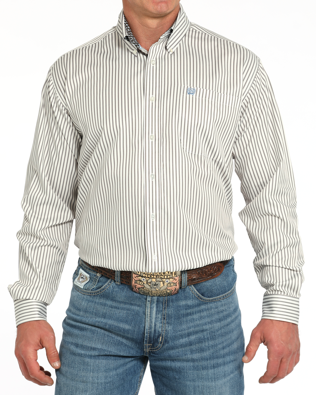 Take your look to the next level with this handsome cream striped shirt engineered by CINCH. Poly/Tencel/cotton twill weave construction features black geometric contrast trim. an open left front pocket. embroidered logo. and cream buttons.