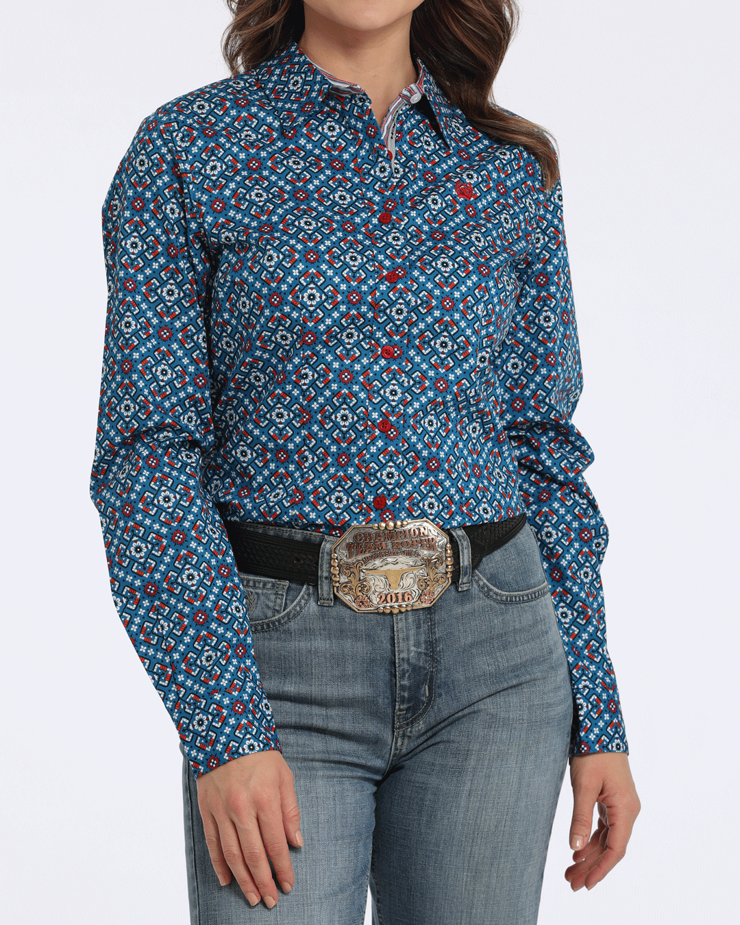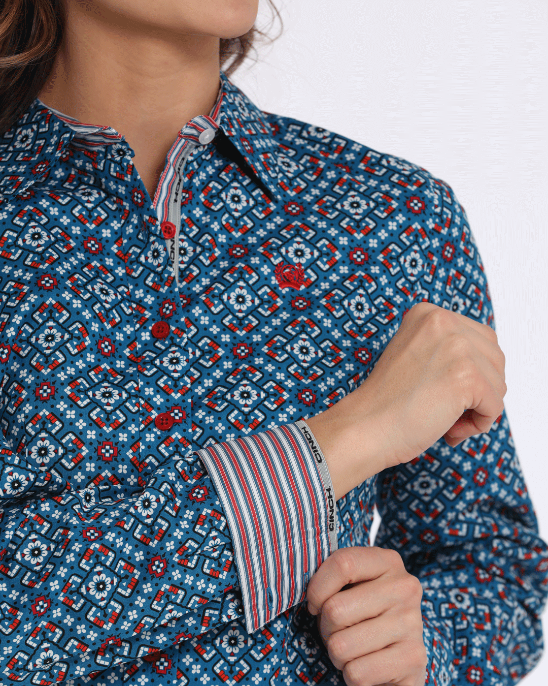 Set the style standard for ranch wear with a classic blue geometric printed cotton plain weave crafted by CINCH. Great for pairing with new blue jeans. this on-trend shirt features multi-color striped contrast trim. logo embroidery. and red buttons.