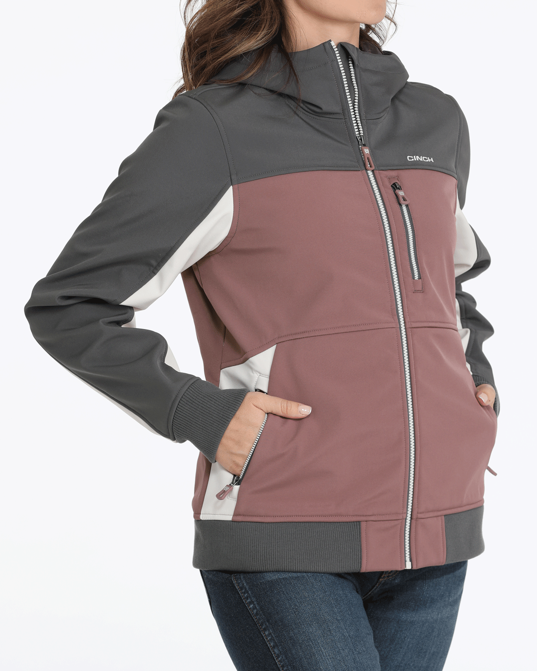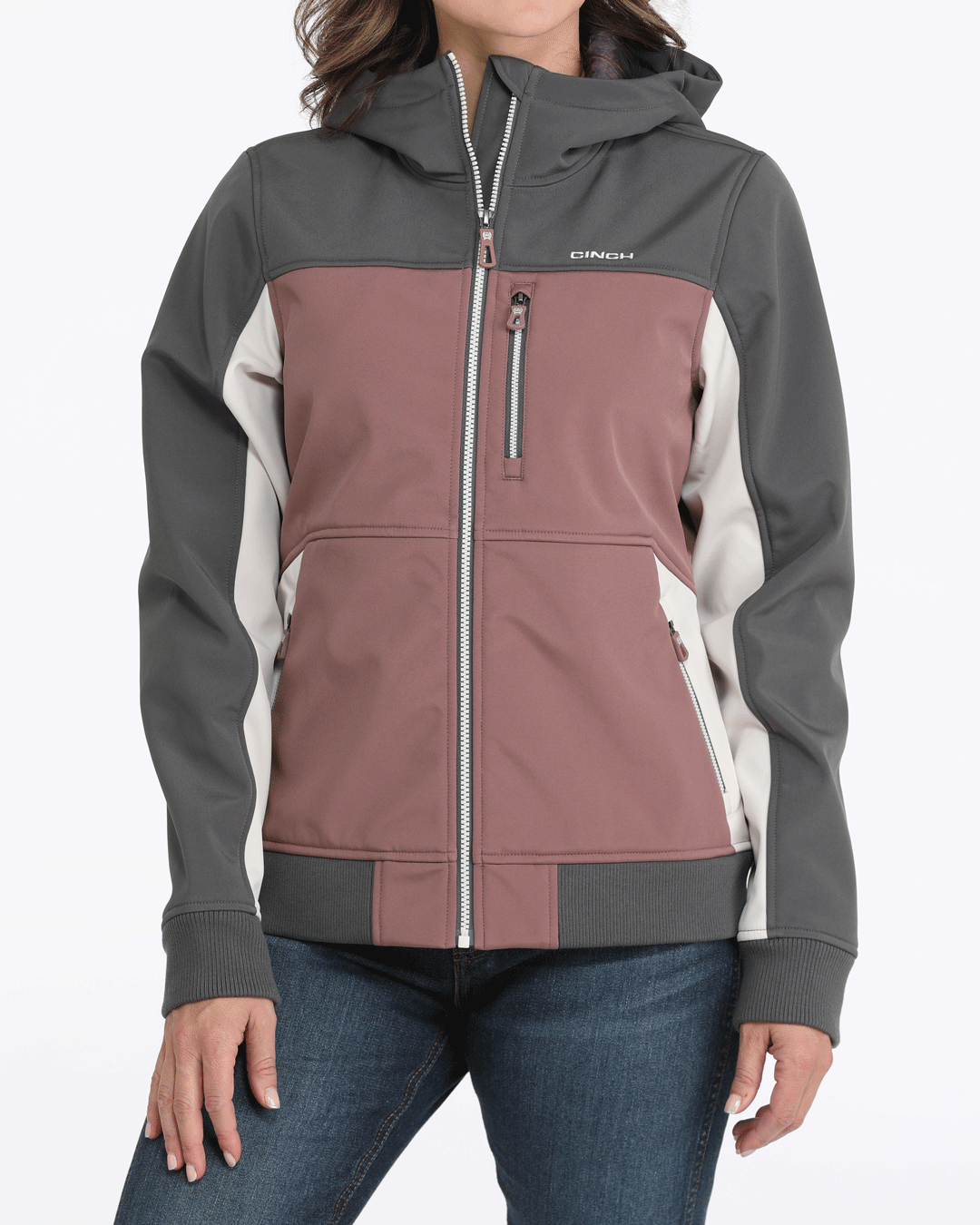 This color blocked bonded hoodie crafted by CINCH is the three-season workhorse you need for upgrading any outerwear collection. Durable multicolor poly-spandex construction features printed polyester lining. rib knit trim. logo embroidery. and Durable Water Resistant (DWR) finish.