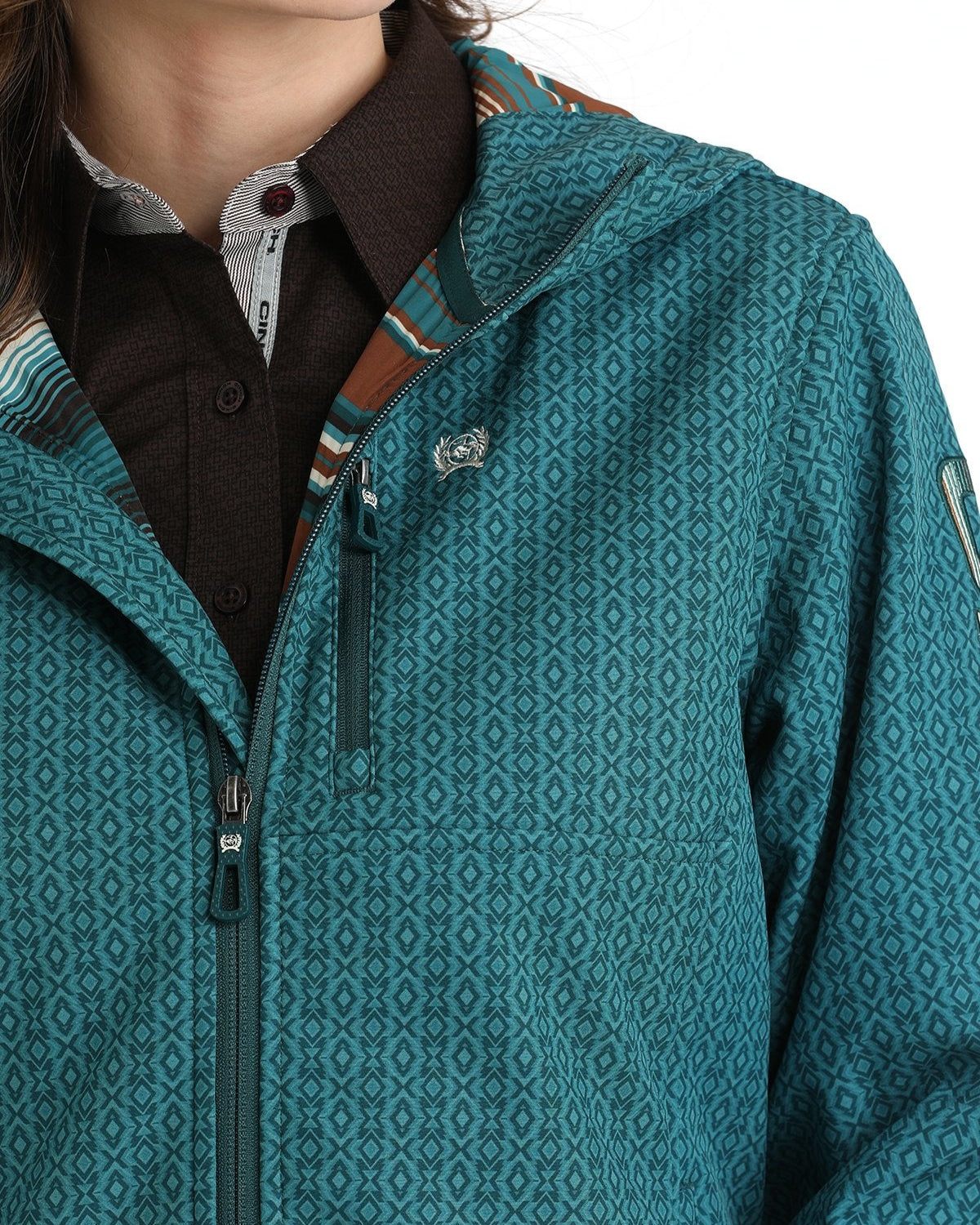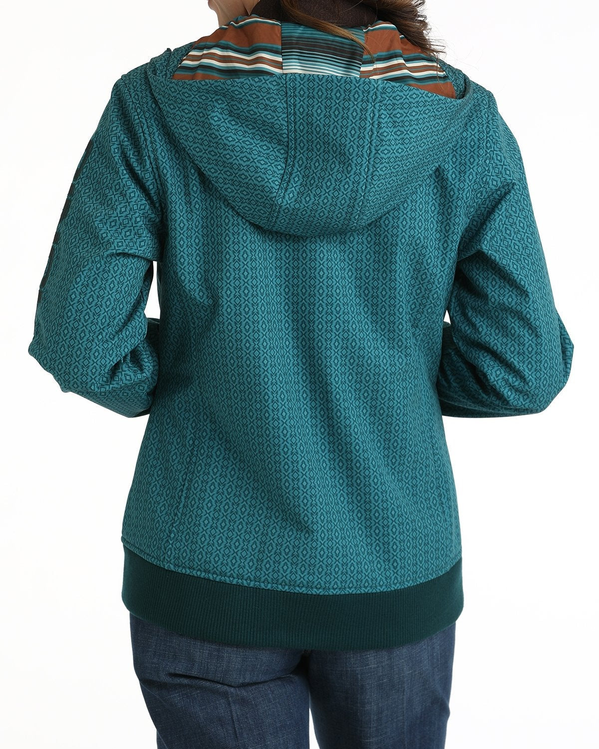 Keep warm and dry when you’re on the run in our teal poly-spandex bonded hoodie. This three-season hoodie provides reliable comfort for your favorite high-performance activities. It features printed polyester lining. exterior pockets. rib-knit hem and cuffs. 3D CINCH logo embroidery. and a Durable Water-Resistant (DWR) finish.