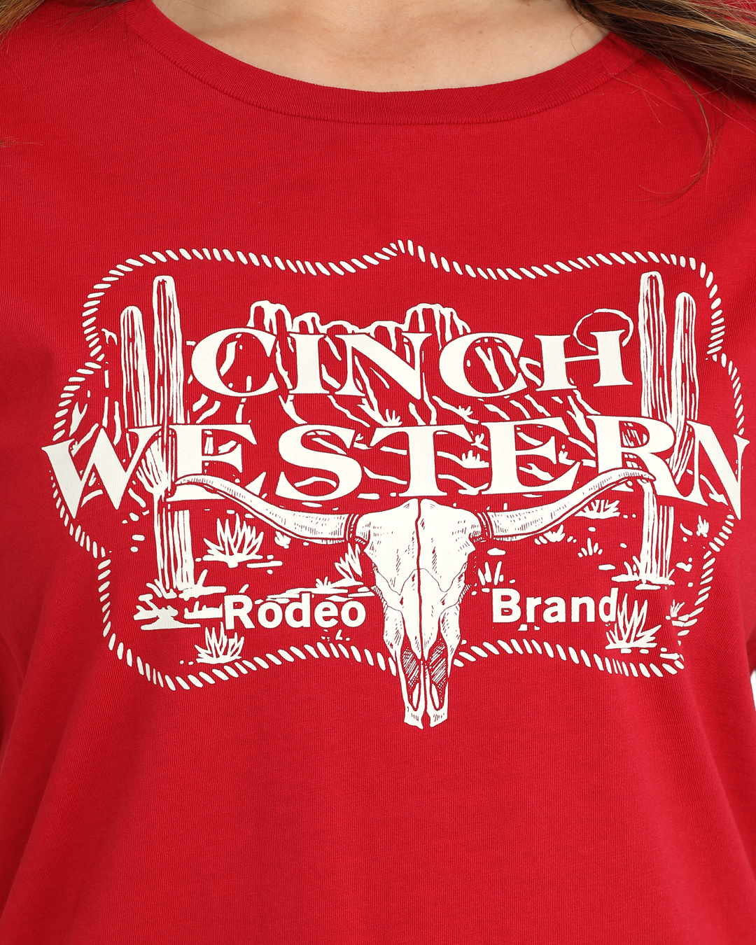 A workable wardrobe relies on the basics. which is why this red soft hand cotton jersey tee shirt belongs in your weekly rotation. Crafted with a CINCH Western Rodeo Brand front screen print. this comfortable tee pairs with any denim in the stack.